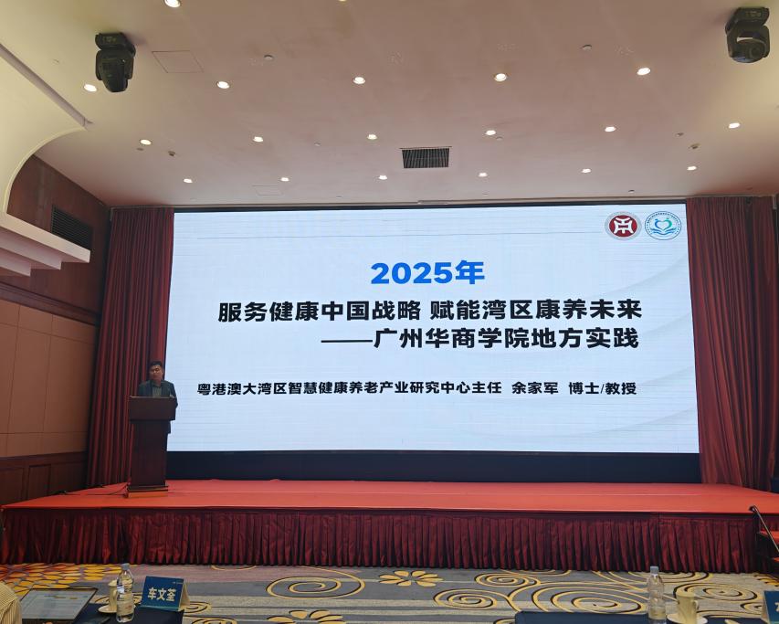 余家军教授作《服务健康中国战略赋能湾区康养未来》主题演讲。他围绕粤港澳大湾区康养产业高质量发展主题,分享了广州华商学院及粤港澳大湾区智慧健康养老产业研究中心在人才培养、学术研究等方面开展的相关工作及实践成果,为推动康养产业发展提供了“华商方案”。
